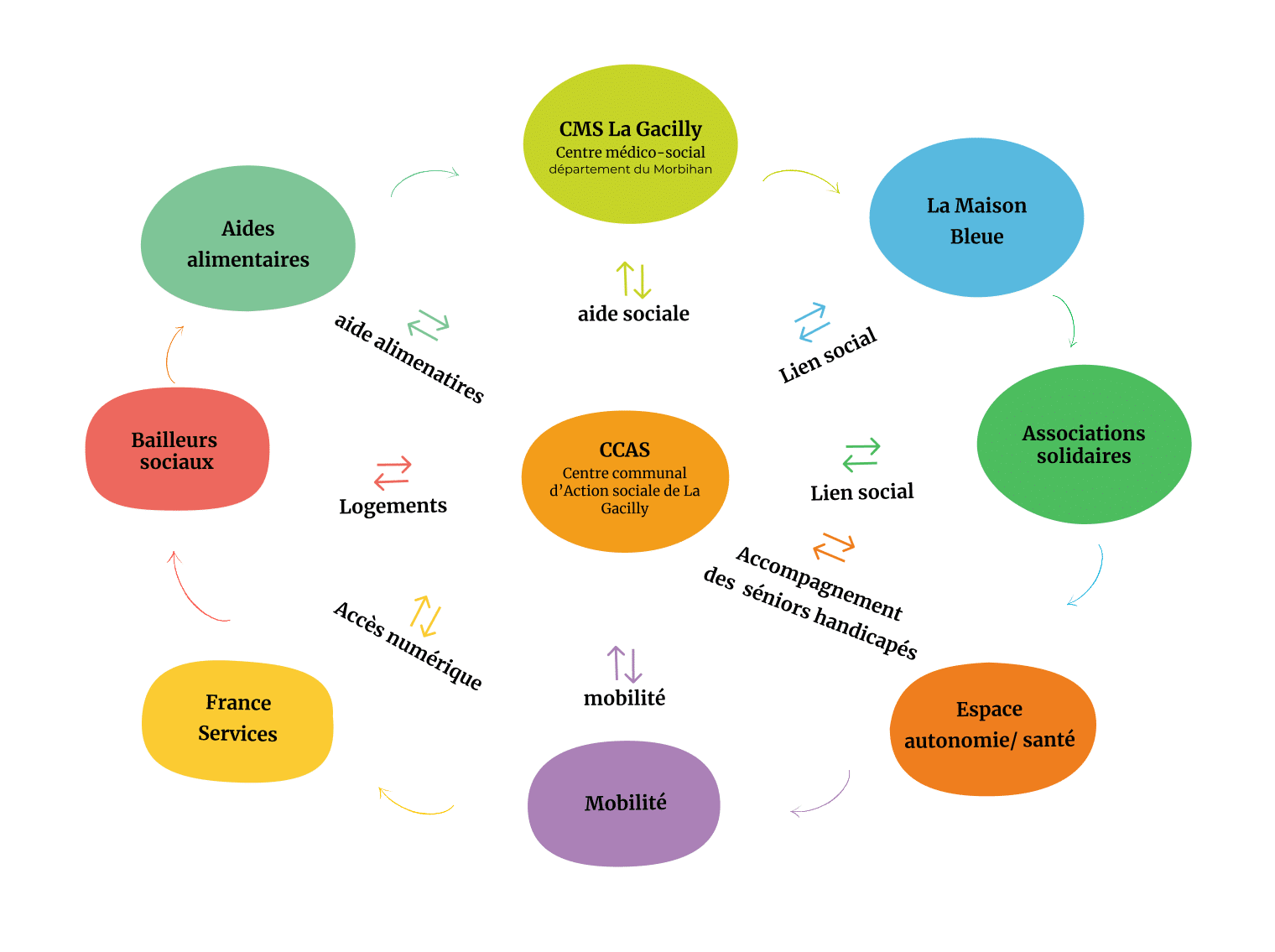 Le Centre Communal d’Action Sociale (CCAS) de La Gacilly est une structure publique locale dédiée à l’aide sociale, à la prévention et à l’animation pour les habitants en difficulté. Ci-dessous, vous pouvez retrouver les différents services qui le composent (cliquez directement sur les bulles pour accéder à la page liée au service). Et voici la liste des menbres du CCAS et leur fonction au sein du CCAS :